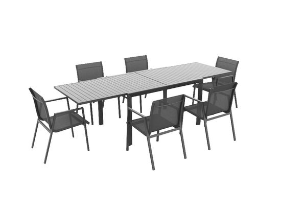 Zarówno łatwy w pielęgnacji rozkładany stół z dwiema blatami, jak i wygodne krzesła posiadają ramy wykonane z wytrzymałego aluminium. Obicie mebli do siedzenia wykonane jest z trwałego tekstylenu, również w kolorze antracytowym. Ten nowoczesny materiał jest odporny na rozdarcia, warunki atmosferyczne oraz przepuszcza powietrze, dzięki czemu nawet w wysokich temperaturach siedzenie jest przyjemnie chłodne. Dodatkowe poduszki na krzesła nie są konieczne. Sprowadź ten luksus do swojej przestrzeni zewnętrznej i ciesz się latem pod gołym niebem.
