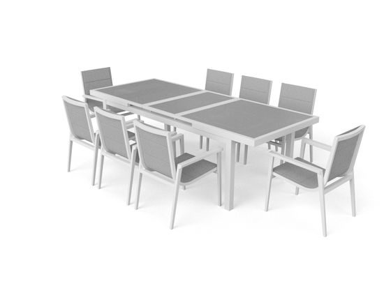 Ciesz się posiłkami na świeżym powietrzu w większym gronie. Elegancki zestaw stołu jadalnego Santorini XL z Kolekcji Ilios zawiera rozkładany stół z szarym szklanym blatem (matowym) oraz osiem krzeseł z podłokietnikami, które posiadają dwie warstwy tekstylenu z szybkoschnącą pianką. Nowoczesny materiał oferuje wiele zalet: jest wytrzymały, oddychający, elastyczny i odporny na warunki atmosferyczne - idealne meble do użytku na zewnątrz. Zabrudzenia można łatwo usunąć wilgotną szmatką.