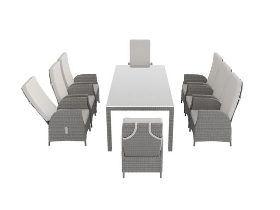 Wyczaruj uśmiech na twarzach swoich gości. Luksusowy zestaw jadalniany Ceres Relax XL z Classics Collection oferuje miejsce dla dużej rodziny lub dobrych przyjaciół. Oprócz prostokątnego stołu z eleganckim szklanym blatem, oferuje również osiem krzeseł z podłokietnikami, z których każde posiada regulowane oparcie. Można je indywidualnie regulować za pomocą zasuwy w bocznej części podłokietnika i dostosować do potrzeb użytkownika. Równie wygodne jak samo nachylenie są jasne poduszki, które pokrywają zarówno siedzisko, jak i regulowane oparcie.