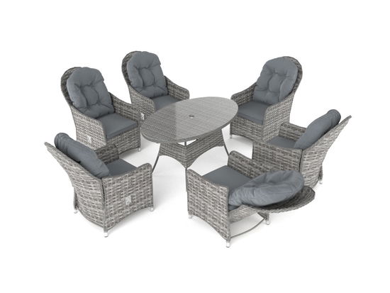 Okrągły stół, elegancka kombinacja sześciu krzeseł z regulowanymi oparciami, które można nazwać raczej fotelami: to idealne warunki do rozmowy podczas jedzenia ciasta lub przekąsek.