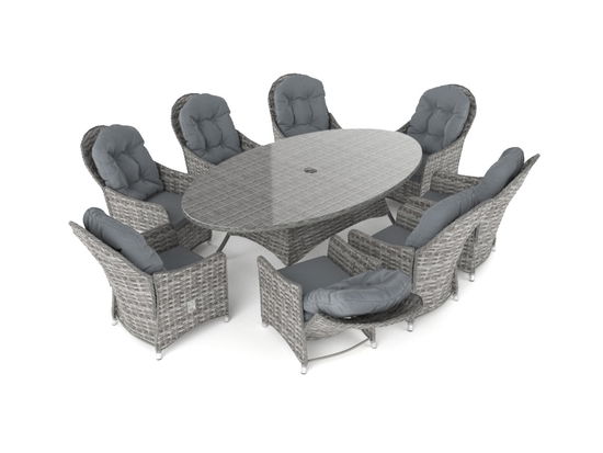 Okrągły stół, elegancka kombinacja ośmiu krzeseł z regulowanymi oparciami, które można raczej nazwać fotelami: To idealne miejsce do rozmów podczas jedzenia ciasta lub przekąsek.