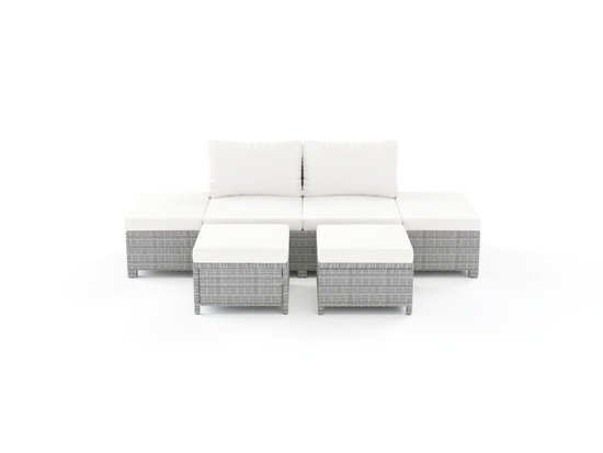 Komfortowe meble ogrodowe posiadają stabilną ramę aluminiową oraz poszycie z melanżowego polirattanu City. Kremowe poduszki na siedziskach i w części oparcia idealnie dopełniają luksusowy charakter. Modułowy zestaw jest wszechstronnie przekształcalny, dzięki czemu leżanka lub 3-osobowa sofa może być również używana jako 2-osobowa sofa z bocznymi powierzchniami do odkładania. To samo dotyczy podnóżków, które bez poduszek mogą służyć jako stoliki kawowe. W tym celu jeden podnóżek jest dodatkowo dostarczany z szklanym blatem, który w razie potrzeby można wykorzystać jako blat stołu.