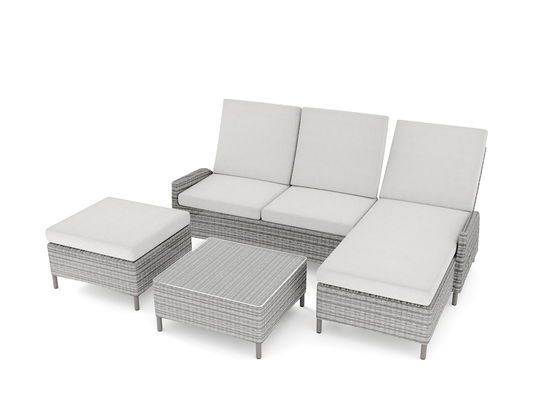 Zestaw wypoczynkowy Pimena z kolekcji Classics Collection nadaje każdej przestrzeni zewnętrznej, a także ogrodom zimowym, przytulny i zapraszający klimat. Grupa składa się z sofy dwuosobowej, wygodnej sofy leżanki, stolika kawowego ze szklanym blatem i podnóżka. Dzięki bocznemu mechanizmowi oparcia można w razie potrzeby pochylić i dostosować do indywidualnych potrzeb. Ten uroczy zestaw wypoczynkowy nie wymaga dużej przestrzeni, ale oferuje maksymalny komfort.